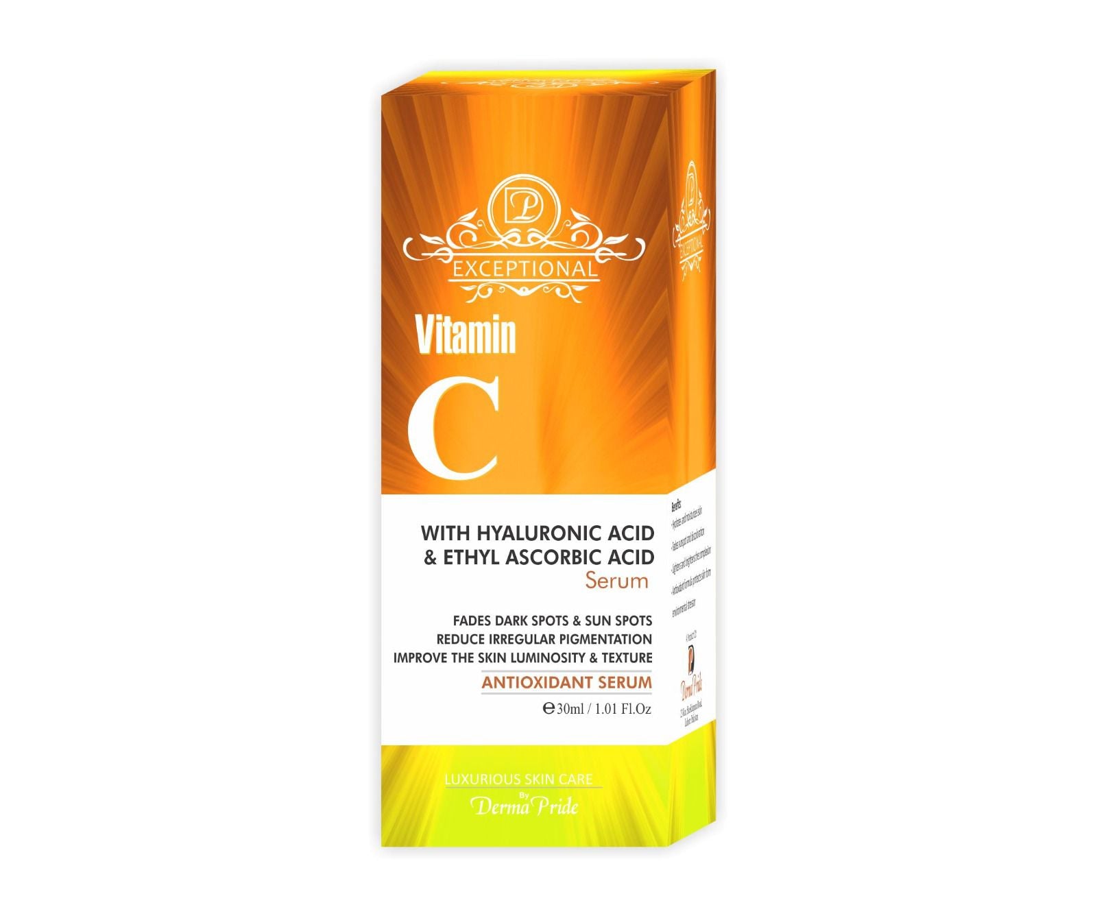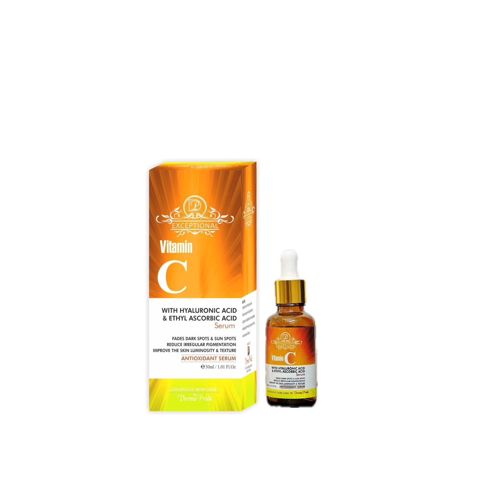 The Vitamin C Serum is a powerhouse skincare solution infused with hyaluronic acid and ethyl ascorbic acid, a stable form of vitamin C. This potent combination helps to brighten the skin, reduce the appearance of dark spots and hyperpigmentation, and promote a more even skin tone. The hyaluronic acid provides intense hydration, plumping up the skin and diminishing the look of fine lines and wrinkles. With regular use, this serum boosts collagen production, enhances skin elasticity, and leaves your complexion looking radiant and rejuvenated.Β